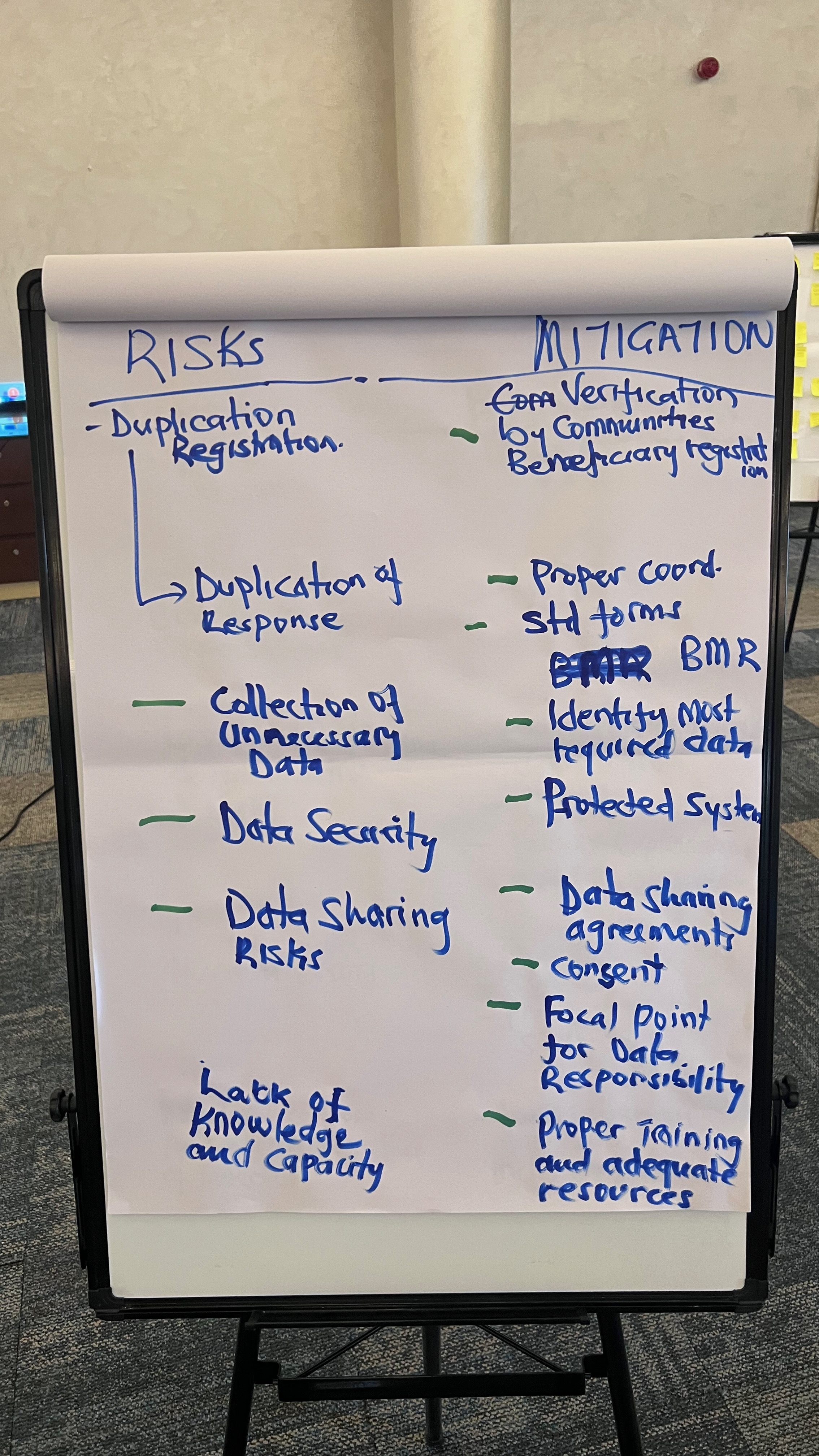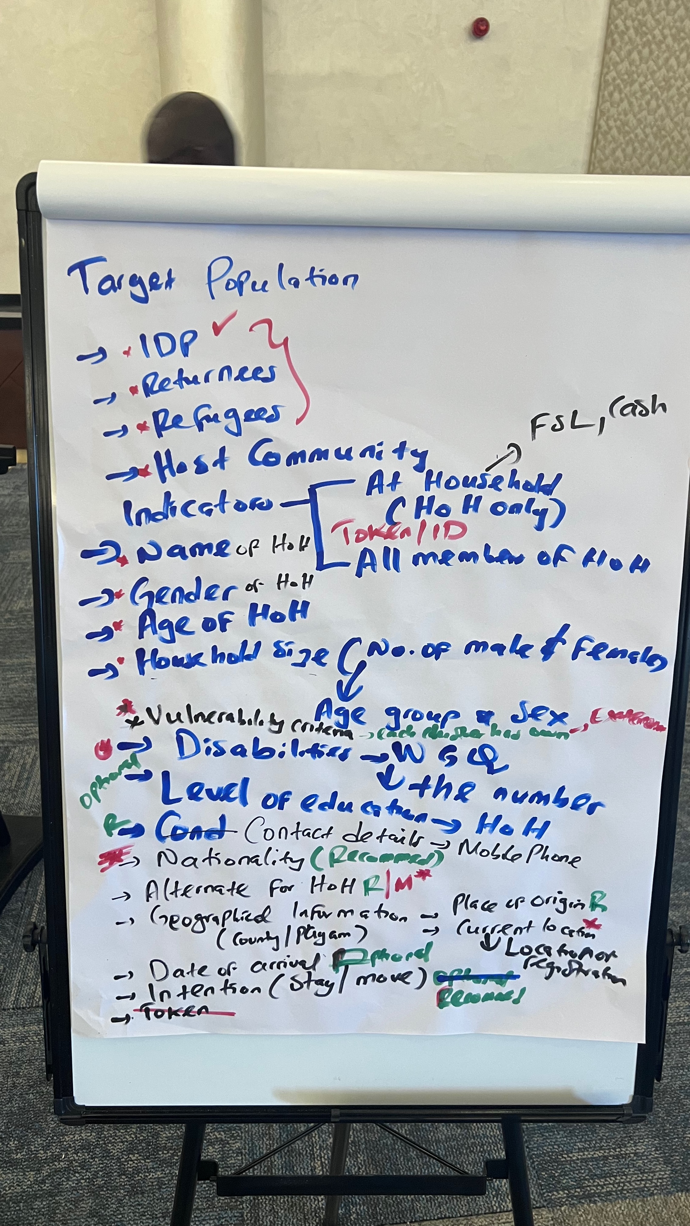 To enable easy standardization of registration form, the group started by identifying target population for humanitarian assistance (IDPs, Returnees, Refugees and Host Community). During the discussion, it emerged that some agencies only register head of household details and number of individuals in a household due to the nature of their program focusing on family size. Further discussion lead the group agreeing to capture detail for all household member. The group noted the need to have a lighter tool to uniquely identify target beneficiary enabling faster registration and efficient response during emergencies. Standardized consent clearly informing the beneficiaries of how the data will be protected, utilized and shared across partners of common interest was noted as the first key part for inclusion in SRF.